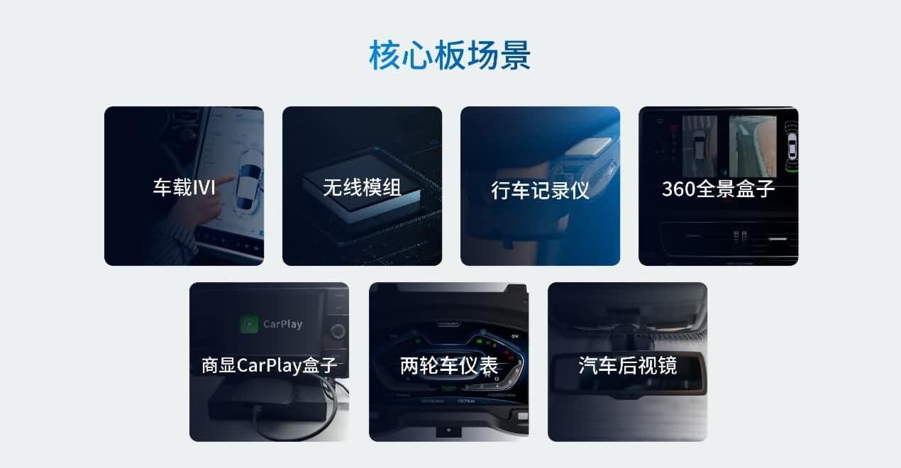 AC8257车联网模组应用场景普遍,,,,,,可使用于车载IVI、无线模组、行车纪录仪、360全景盒子、商显CarPlay盒子、两轮车仪表和汽车后视镜等场景,,,,,,助力汽车实现车机互联和车网互联。。。。。