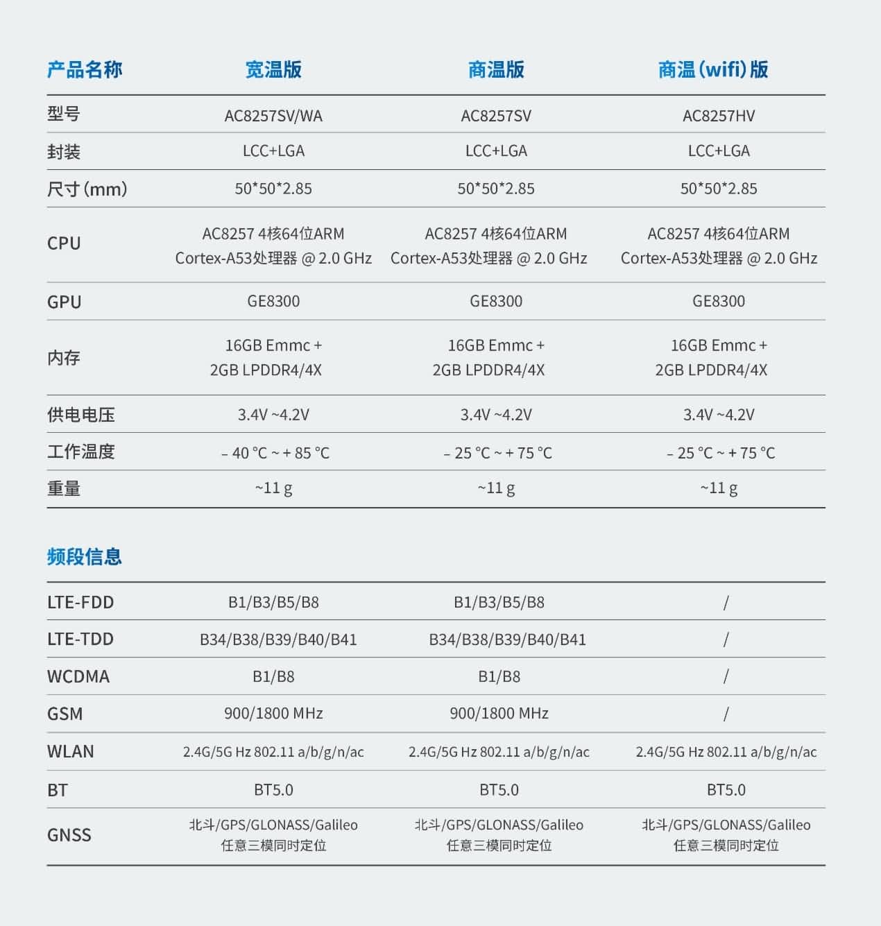AC8257车联网模组可提供完善的开发配套效劳,,,,,,包括软硬件开发配套、调试开发工具、开发和升级工具、物料QVL、功效和算法集成等,,,,,,内置生态集成度高。。。。。