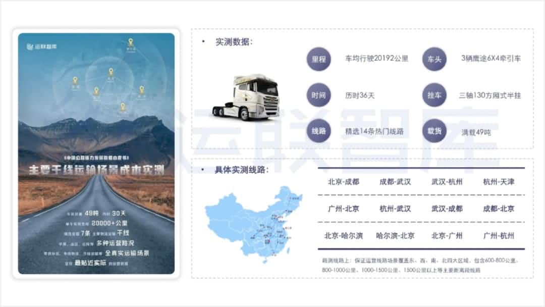 本次白皮书数据泉源分为三块。。。。。其一是宏观大数据,,,, ,,,,主要来自:国家统计局、交通部、中寰卫星等平台; ;;;;其二是实测的线路数据,,,, ,,,,由本次路测方一汽解放测试并提供,,,, ,,,,并团结中寰卫星车联网大数据举行验证; ;;;;其三是车队调研数据,,,, ,,,,由运联研究院针对多条线路车队,,,, ,,,,举行实地走访完成网络。。。。。运联通过其专业的研究能力、普遍的资源链接、实地的一线走访,,,, ,,,,把获得的精准真实的运营数据,,,, ,,,,还原到基础的逻辑层面,,,, ,,,,形成客观的、系统性的、对行业有价值的剖析与判断。。。。。