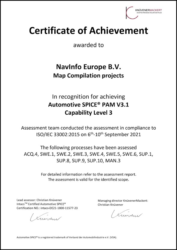 克日 ,,,,,pa电子游戏欧洲(NavInfo Europe B.V.)乐成获得Automotive SPICE 三级(简称:ASPICE L3)认证证书。。。。。这一成绩批注pa电子游戏欧洲的地图编译产品和效劳切合最严酷的全球汽车行业流程质量标准。。。。。pa电子游戏将使用该流程继续为国际大型OEM提供高质量的编译软件和数据分发效劳。。。。。
