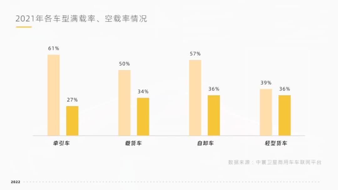 白皮书还通过天下运力平均吨位的上涨反应出车效提升。。。。。据中寰卫星车联网大数据显示,,,, ,,,,2021年,,,, ,,,,各车型满载率情形划分为:牵引车60.72%、载货车49.58%、自卸车56.76%、轻型货车39.29%,,,, ,,,,整体略微提升。。。。。